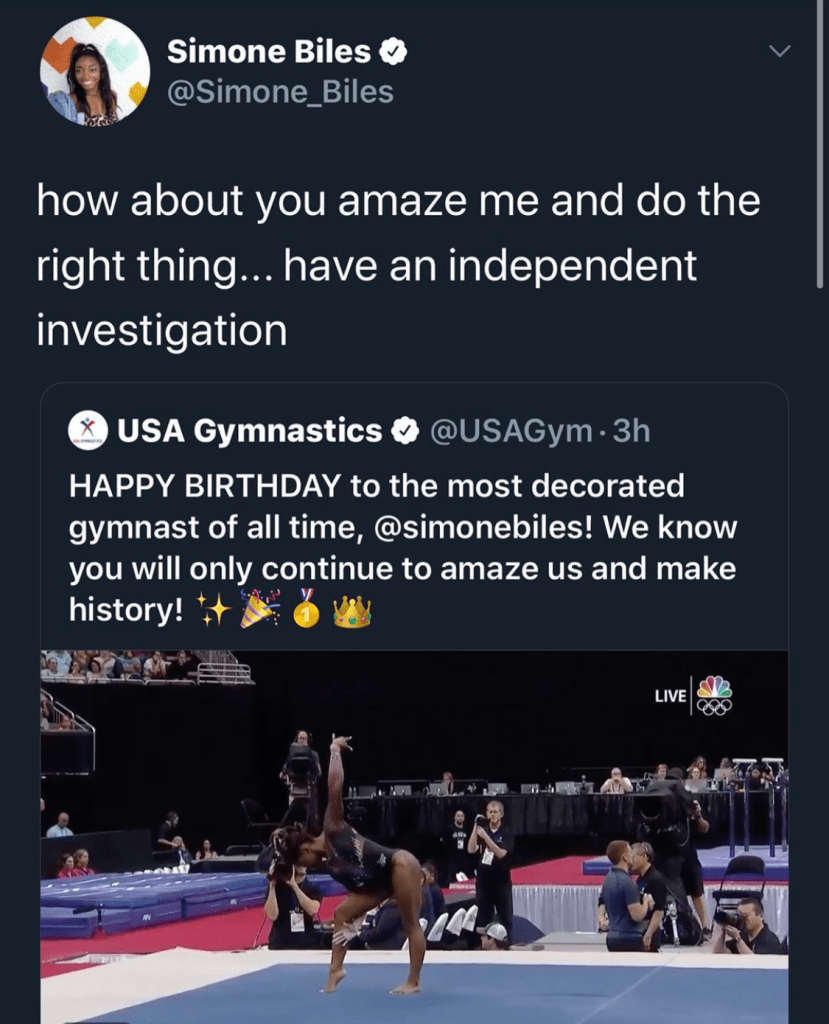 2012 and 2016 Olympic Champion Aly Raisman made an appearance on The Today Show, expressing understandable outrage about how the organization could bungle a settlement proposal so badly, especially as their athletes are preparing for this year’s summer games. Simone Biles, on her way to USAG’s mandatory training camp, tweeted: