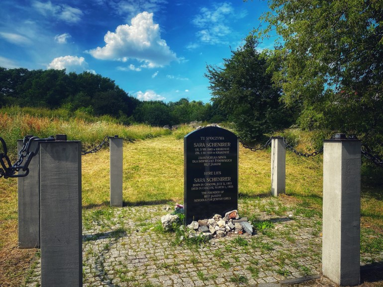 There are two entrances to the camp: the first is from the west and on the path from Krakus Mound (photo here). The second entrance is through a number of apartment buildings to the main entrance of the camp (photo below). While we took the more adventurous route through Liban Quarry–and I would recommend if you have time to visit all three sites–it was jarring to literally stumble out of a path and onto “the most horrific place in Kraków” without as much as a sign or marker of a place of unimaginable terror and where thousands are buried in unmarked graves. This is very different from my visit to Auschwitz-Birkenau. I’m incredibly grateful for the In Your Pocket guide to the Camp because otherwise we would have been (even more) lost.We stumbled upon this sign marking the second entrance (the main spot) to the site. In 1945, seeing that the war was lost, the Płaszów camp was liquidated; in an attempt to cover their crimes, prisoners were forced on a death march to Auschwitz. Those who survived the march were killed in the gas chambers. Płaszów was dismantled, mass graves exhumed, bodies were burnt, and ashes scattered across the site in an attempt to hide the crimes that took place here from the incoming Soviet Army, who entered the city on January 19th. The site today is exactly how the Soviets would have seen the former camp when they captured Kraków from the Germans.The Grey House originally belonged to the Jewish community but during the war was used by the Nazis–specifically, the office of Camp Commandant Amon Goeth and where he randomly shot prisoners as depicted in Schinder’s List–to house the camp’s officers. One of the only buildings still standing in the camp, it was known as a place of horror and torture for inmates.One of the oddest aspects of the memorial for me is the close proximity of residential buildings to the site.Today, the space is used as a park by locals; I saw a number of people walking their dogs along the paths.The monument to Sarah Schenirer was built in 2005. Schenirer (1883-1935) founded the first religious school for girls in Kraków, a model that was repeated across Poland; over 250 schools were opened in the country during her lifetime. Schenirer’s original headstone was destroyed when the camp was builtand activists rebuilt this headstone in the supposed spot of resting place.You can see the rubble of the former pre-burial hall in the background.The Roll Call Area (Apellplatz) was a platform for roll-calls and selections for prisoners of the camp. Here, medical examinations took place to determine how “fit” for work the inmates were for the intense labor used for Płaszów. This site was built on two mass graves of the bodies of mostly women, children, and the elderly from the liquidation of the Kraków Ghetto in March 1943; the Nazis dug these two large pits the night before the ghetto was closed and its inmates were transported here, the Belzec extermination camp, or Auschwitz-Birkenau. Camp prisoners later that summer were also executed and buried in these mass graves. Over 3000 people are estimated to be buried at this site.The site of the New Jewish Cemetery, established in 1932 after Podgórze became part of the city of Kraków. These remains were discovered fairly recently as landscaping of the memorial restarted after decades of neglect. Unfortunately, because the headstones were used to pave the roads of Płaszów, it is unknown who is buried here. This is close to Apellplatz.Near the main entrance of the camp (note the apartment buildings on the left) is the rubble of the Old Cemetery of the Podgórze Jewish Community’s pre-burial hall. This absolutely gorgeous hall was built between 1920-1932 and was a source of pride for the local Jewish population here. At the beginning of German occupation, the once holy site was used as a stable for livestock.When the Nazis decided to expand the camp, they demolished the hall to construct train tracks; the demolition was a source of amusement for the SS, who made a public spectacle of the destruction of this once holy building that stood over 25 meters (82 feet) high.
