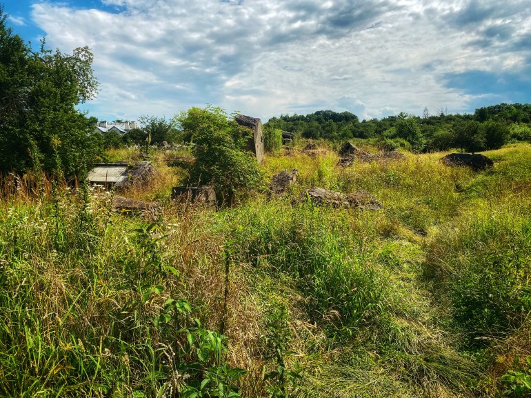 The site was also used by Steven Spielberg to film Schindler’s List in 1993. Photo via Untapped Cities. I wanted to use the above photos of the inside of the quarry so you can see the current state of the site. While there are a few tours available (and an open entrance), this was even too much of a heights + safety issue for this usual trespasser. All of my photos were taken from the very narrow path between Krakus Mound and Płaszów.And by narrow path, I mean TINY. There was only space enough for one person to travel down the hill.The quarry can be entered at the end of this path. As the site was used for filming, many of the props for Schindler’s List were left behind, making for a confusing site of artifacts and filmmaking objects. For example, there is a small (and currently inaccessible) memorial to the 21 inmates murdered here during the liquidation of the camp. However, the discomforting walkway of Jewish headstones is a left-over from the film set. The real prisoners of this camp would have walked across the headstones of their ancestors to and from the quarry to Płaszów.
