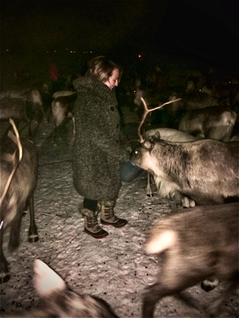 Here I am attempting to pet the reindeer as if they were large dogs when, just like my own dogs, they just wanted snacks and to run around. While we were there, we saw glimmers of the Northern Lights above the fjords, surrounded by hundreds of reindeer. It was amazing.