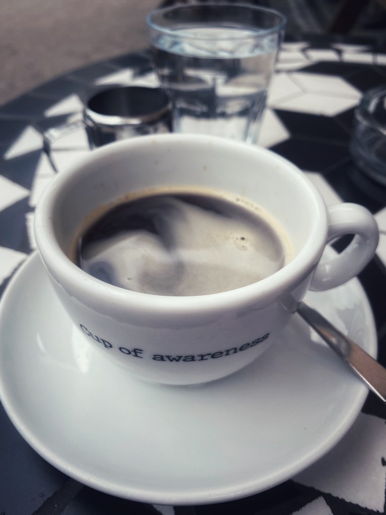 Here’s the thing: this mug of black King Bean dark roast (Charleston, SC) coupled with this delicious vegan birthday blondie dropped off on my porch by a dear friend is truly all you can ask for in the world.