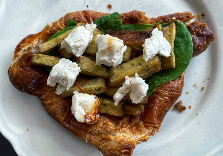 This is normally how I snack: I hoard all the great grocery finds from a new city and throw them together into a croissant. This locally made chickpea vegan cheese from Kucha (Ljubljana) was soo good.