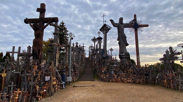 Visiting Lithuania’s Kryžių Kalnas (Hill of Crosses) was one of the most eerie and unusual wanderings I’ve had the opportunity to experience. Shockingly, we had the space to ourselves! While the origins of the Hill of Crosses varies based on legend and lore, the hill consists of more than 100,000 crucifixes and other religious icons; the space remains a pilgrimage for many. First mentioned in 1850–but legend holds that the Hill of Crosses is much older than that–as a memorial for surviving relatives of victims fighting against the occupying Russian government (the Russians stifled Lithuanian identity and honoring the dead); cross-making is a part of the cultural heritage of Lithuania and a way to unite the people. Another legend holds that an apparition of the Virgin Mary instructed believers to cover the space in holy icons.