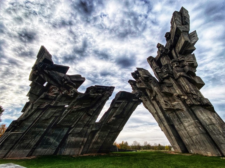The Ninth Fort near Kaunas, Lithuania has a complicated and horrific history as the land changed hands between political powers. Constructed as the last part of the Kaunas Fortress complex built to protect the Russian Empire’s western border–independent Lithuania was “absorbed” into Russia in the late 1800s–the Ninth Gate was completed on the eve of WWI. From 1940-1941, the Soviets used this space to house political prisoners before being sent to Gulag forced labor camps. During Nazi occupation, an estimated 50,000 Jewish people were murdered and buried here as a part of the Kaunas Massacre. Above is the site of the mass execution and burial place, located behind the fort’s structure. The “Fort of Death” was liquidated in 1944 and after WWII, the Soviets used the Ninth Fort as a prison. Unveiled in 1984, the Ninth Fort Memorial stands at 32 m (105 feet) tall and commemorates the mass burial place of the Jewish victims of the Nazis buried in the field here.We were so lucky to stop by the space and essentially have the area to ourselves.