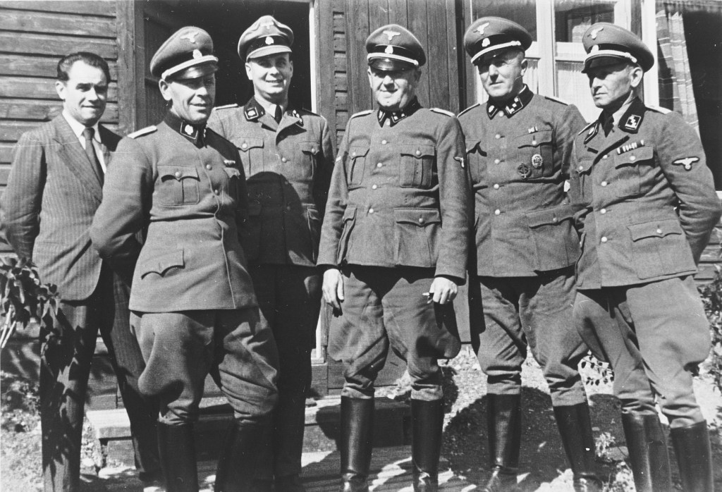 Description: Far right is Anton Ganz, second from right is Paul Sporrenberg (commander of the camp from 1942-1945) and center is Hermann Pister, the first commander of KZ Hinzert and later commander of Buchenwald from 1942-1945.