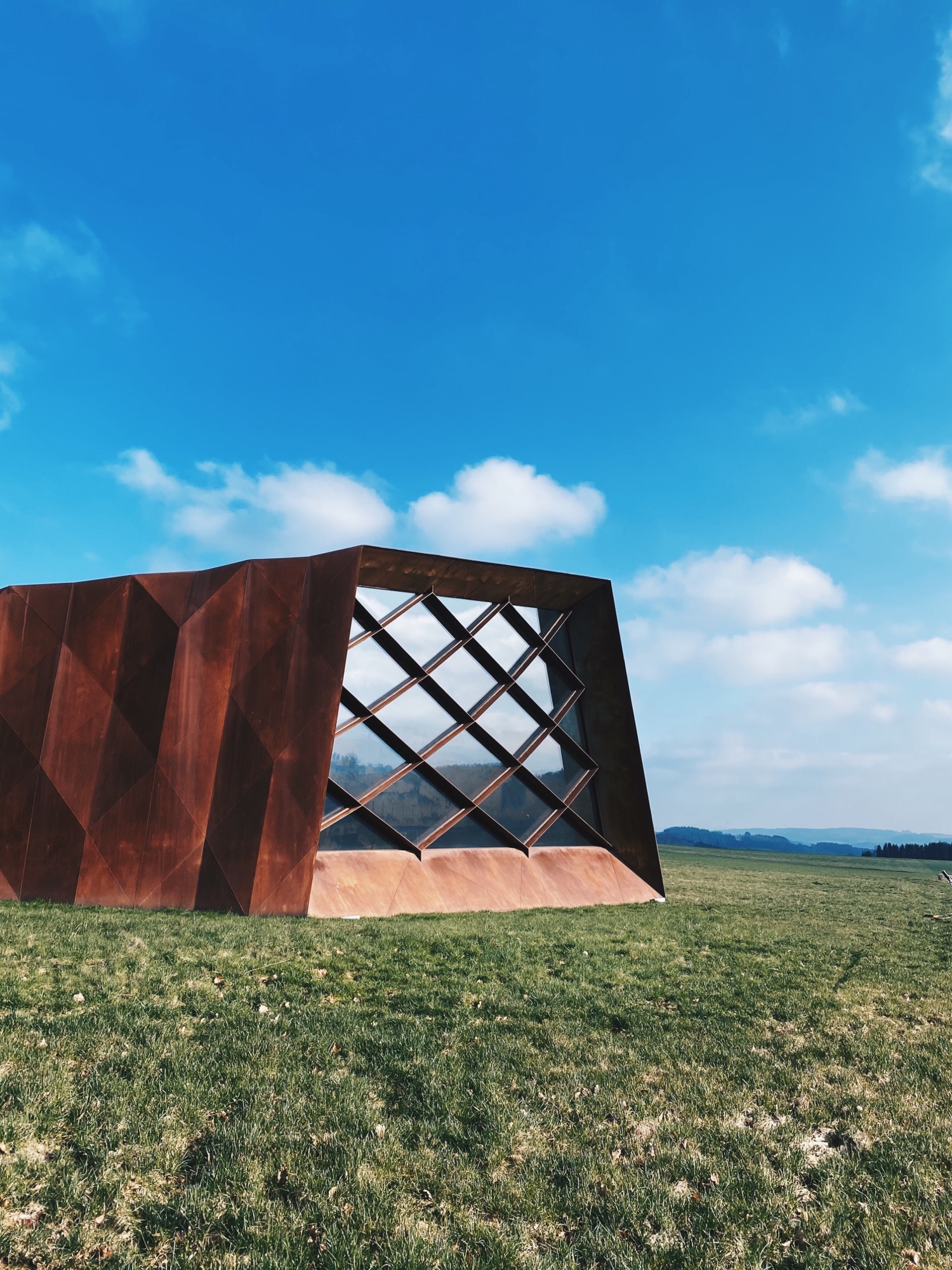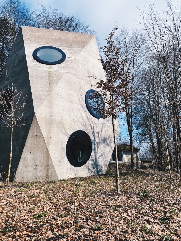 “pursue the fundamental thoughts which portray the ambivalence of the present day idyll and the crimes of the past. They wanted to build a building ‘that reveals a fault of the countryside which deceives us of the idyll of this place’. With this building they wanted to set a ‘mark of an irritation.’ The exhibition to be integrated in this building was to be marked by the view to the grounds of the former prisoner’s camp.”